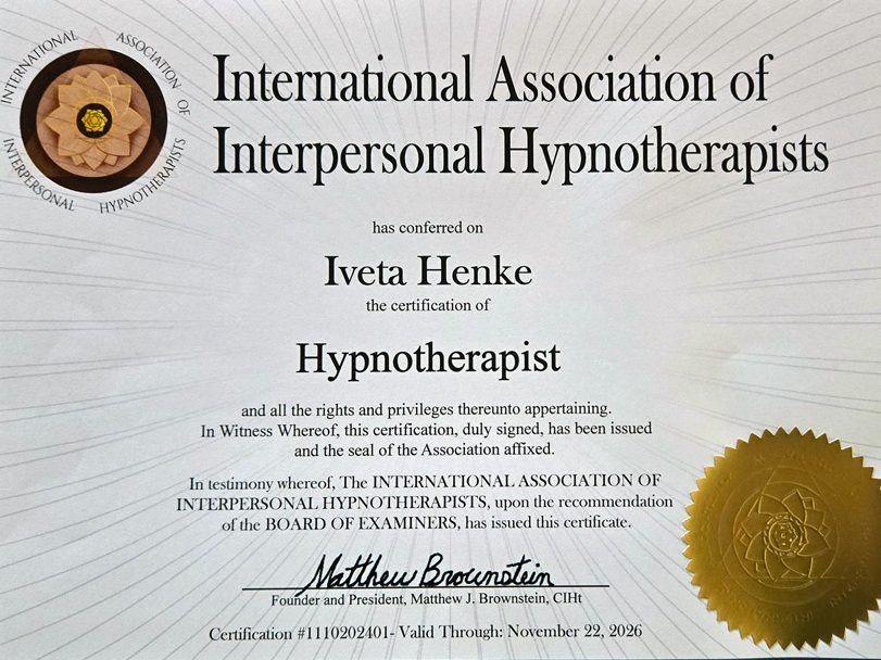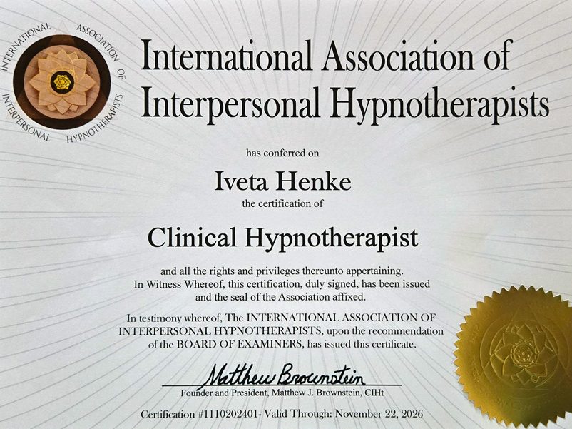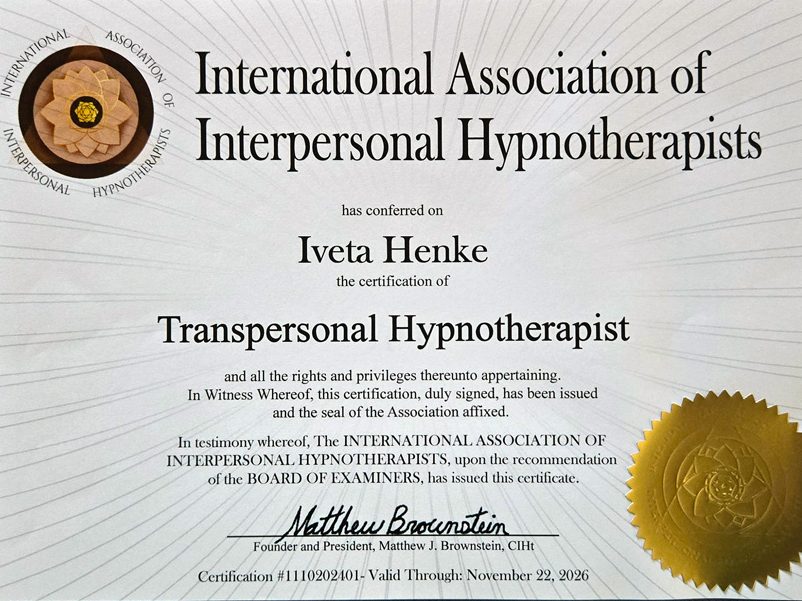 Clinical & Transpersonal Hypnotherapist, member of the International Association of Interpersonal Hypnotherapists. Certification #1110202401